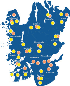NU-sjukvårdens upptagningsområde. Prickarna i orange visar NU-sjukvårdens ambulanser som är tjänst under dagtid. Gula prickar visar antal kommunsjuksköterskor som har möjlighet att åka på IVPA-uppdrag.